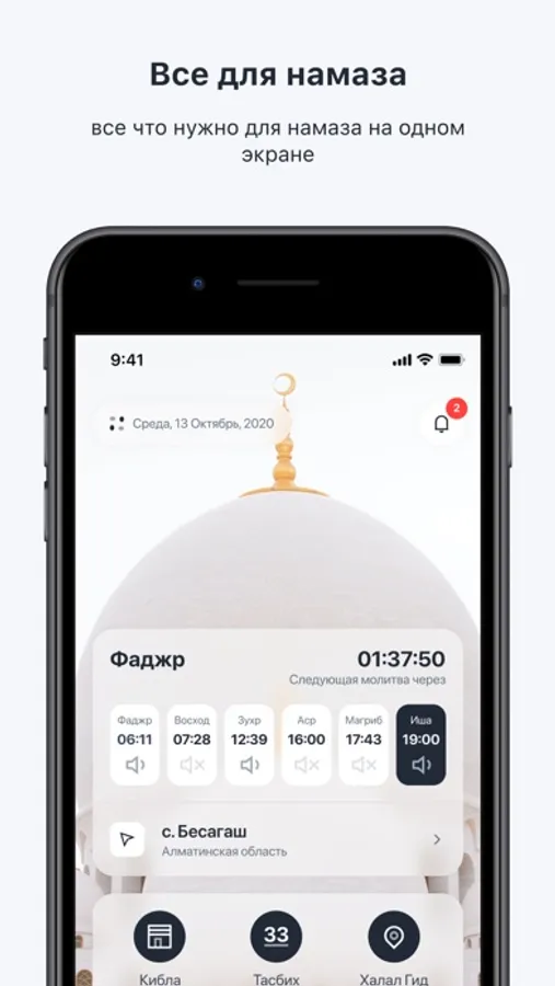 Приложение показывает точное время намаза по Вашему местоположению прямо на главной странице. Вы можете легко настроить уведомление в виде Азана, а также push уведомления, чтобы напоминать о наступлении времени намаза.
