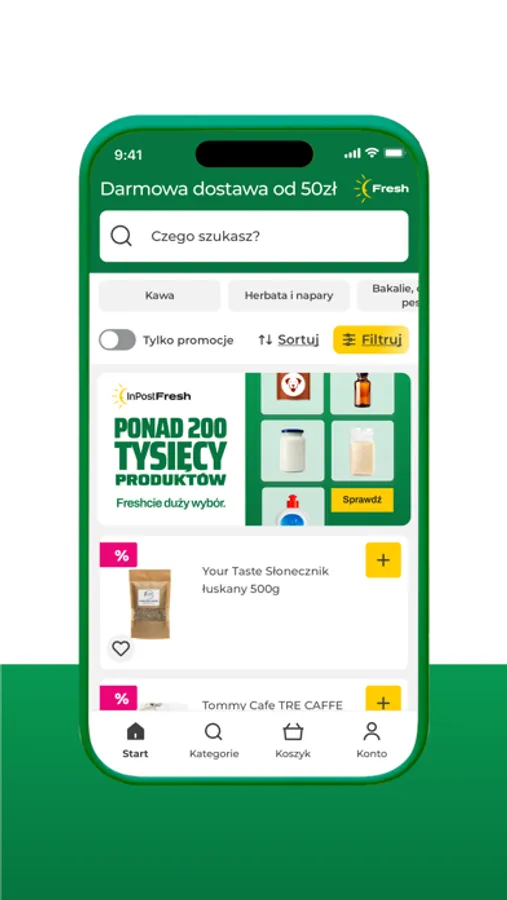Wygodne zakupy i szeroki wybór produktów? To możliwe z InPost Fresh! Pobierz naszą apkę, zarejestruj się i odkryj ofertę dopasowaną do swoich potrzeb. W aplikacji znajdziesz m.in. jakościowe produkty spożywcze, chemię domową czy kosmetyki w dobrych cenach. Zarejestruj się i zgarnij kody rabatowe o łącznej wartości 35 zł na trzy pierwsze zamówienia. Nie zwlekaj!