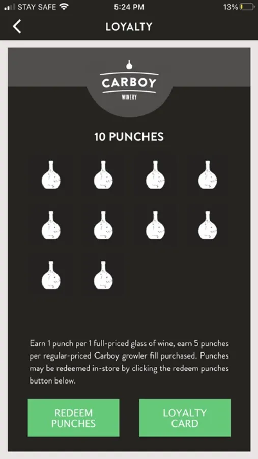 At any participating Carboy Winery and sister restaurant, where applicable (Angelo's on 6th, Angelo's Littleton, Ivy on 7th, Gold Pan Saloon and Logan St), earn 1 point for every regularly priced glass of Carboy wine and 5 points for every regular priced Carboy growler fill. Points can be redeemed for free Carboy wine by the glass (6 points per glass) and/or free Carboy growler fills (30 points per fill).