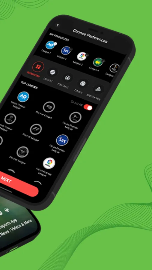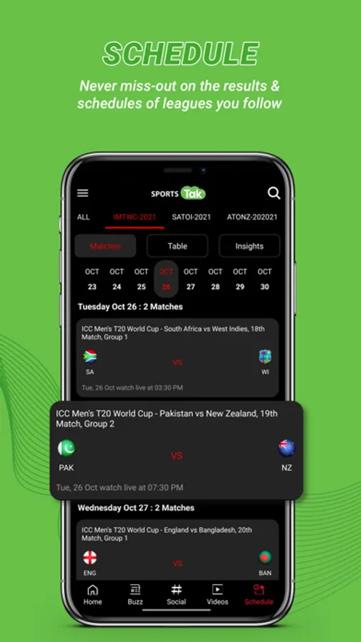LEAGUE WISE - Leagues are in of the top navigation bar and the bottom navigation bar has Buzz, Videos, Schedule and Live scores. When you chose a league from the Top bar, then correspondingly you can correspondingly view the content of that league by choosing any tab in the bottom bar.