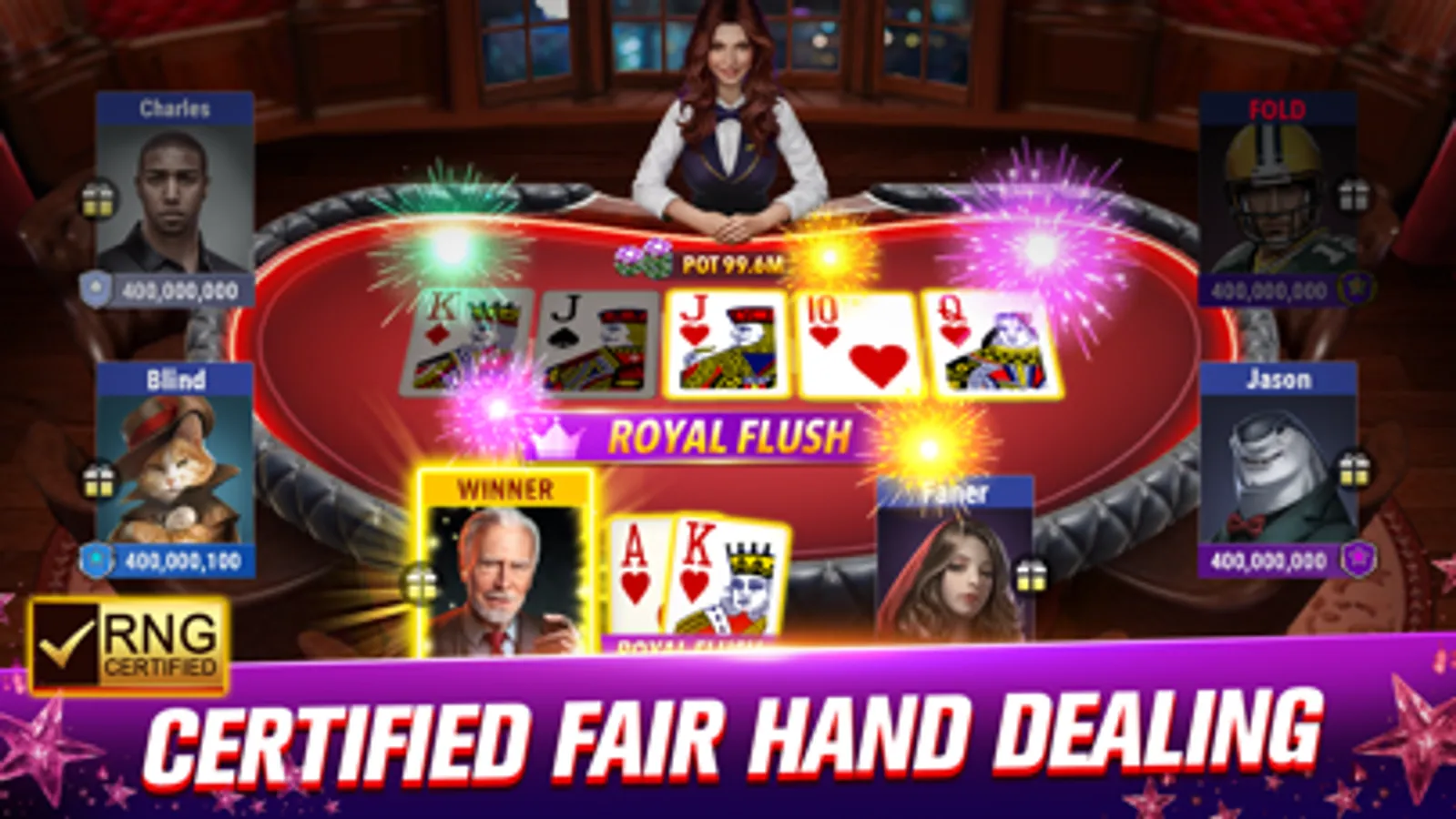 • Fair Play: The card shuffling algorithm is certified by GLI Labs, ensuring a fair and clean game. You can check the certification by going to the in-game Settings > Certification!