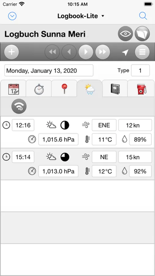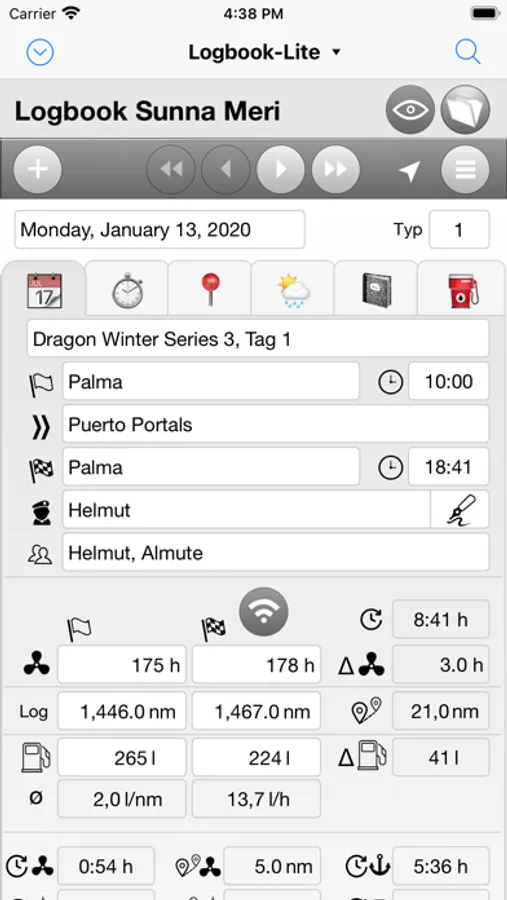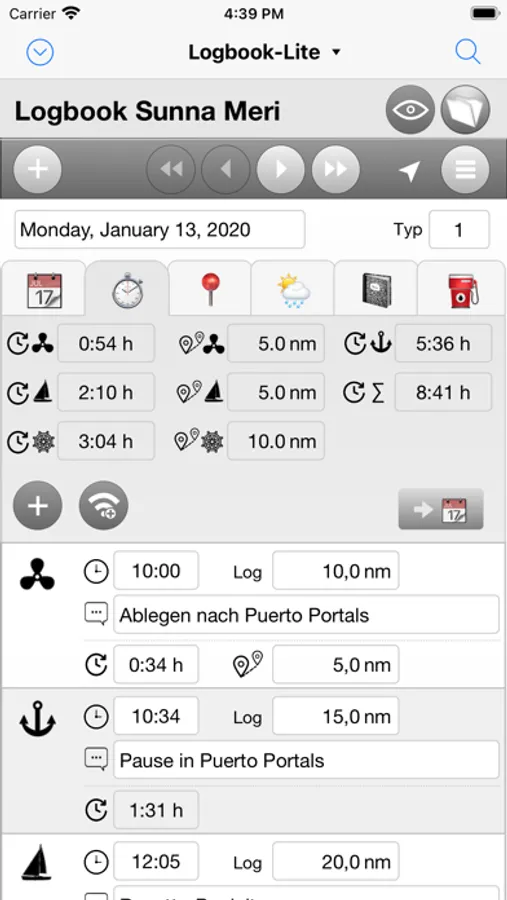The input areas of Logbook Lite are clearly divided and you decide according to your preference which areas you want to use. In the simplest case, only data about the start and end of the trip is recorded. If you want to enter more information in your logbook, you can, for example, enter when the engine was turned on and off again or when you set sail. You can also enter intermediate positions (as a GPS position or as a free location) and continuously record current weather data or have it entered from the onboard instruments in Logbook Lite.