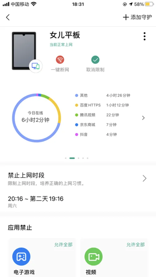 -儿童上网:可以对儿童的终端设备进行网络限制,支持按时间、应用、网址等多种方式进行限制,为儿童营造专注的学习环境。