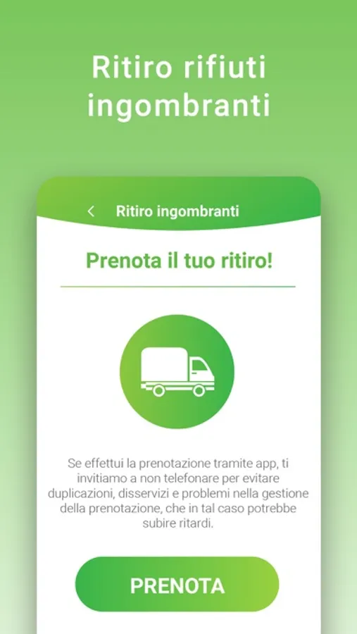 - prenota comodamente tramite l'apposita sezione il ritiro dei rifiuti ingombranti e ricevi le notifiche sullo stato di avanzamento della richiesta;