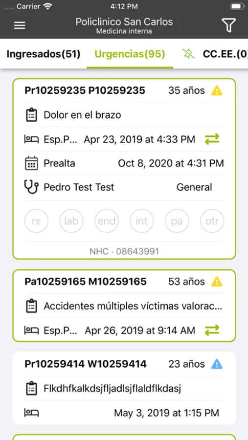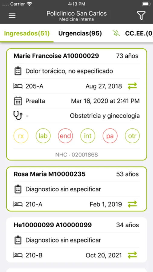Puedes acceder a la información básica de los pacientes ingresados, en urgencias y consultas externas. Así como filtrar la información para buscar a un paciente en concreto.