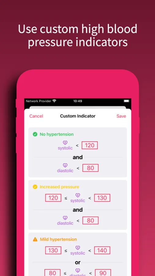 We also designed a special high blood pressure indicator based on symbols and colors. The indicator messages are based on the guidelines of the American Heart Association, Inc. It is also possible to provide your own hypertension configuration for the indicator.