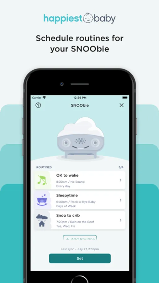 Connect and have fun with your SNOObie routines! Choose your favorite SNOObie light + sound cues to create up to 4 routines at a time that fit your family. To create a routine, pick your preferred light color, sound, time, and day(s) of the week. Once you save the routine, set it by tapping your device to SNOObie, and your routine will be ready to play when the scheduled day and time arrives.