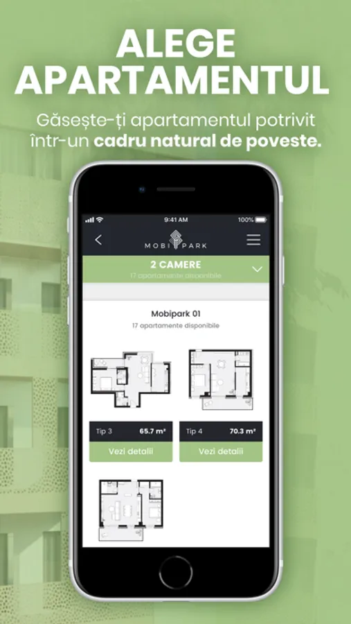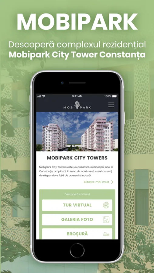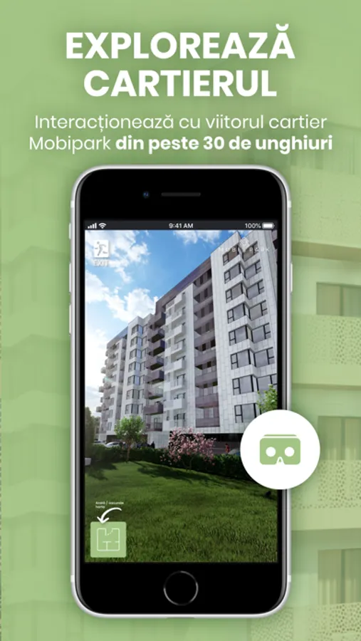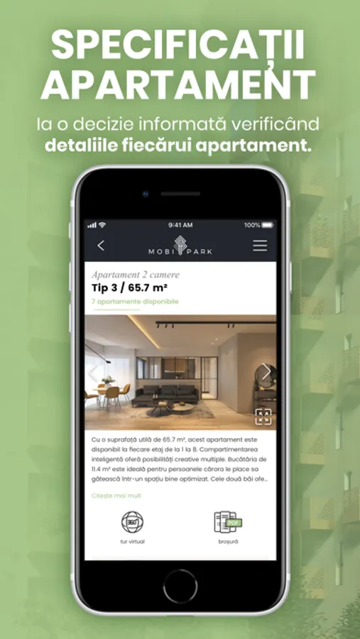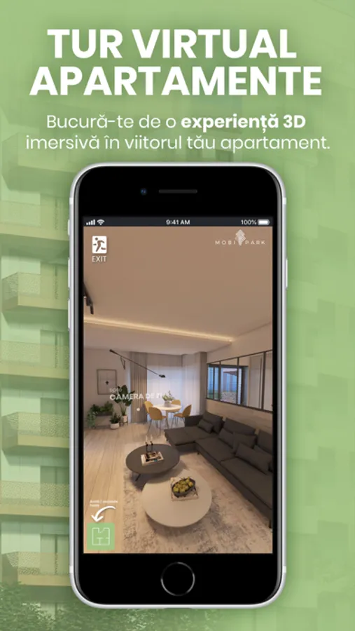 Descoperă cartierul Mobipark direct de pe dispozitivul tău mobil. Ai acces la o galerie foto variată și poți explora atât cartierul cât și apartamentele prin intermediul tururilor virtuale 3D.