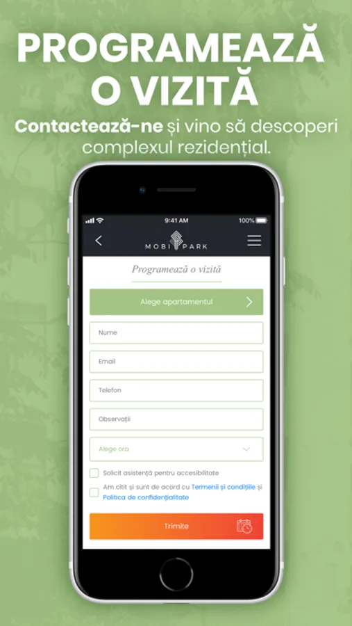 Poți programa o vizită la showroom-ul Mobipark sau îți poți alege apartamentul pe care dorești să îl vizitezi, din cele 9 modele - de tip studio, 2, 3, 4 camere sau duplex. Suntem nerăbdători să-ți povestim mai multe despre proiectul nostru inovator.