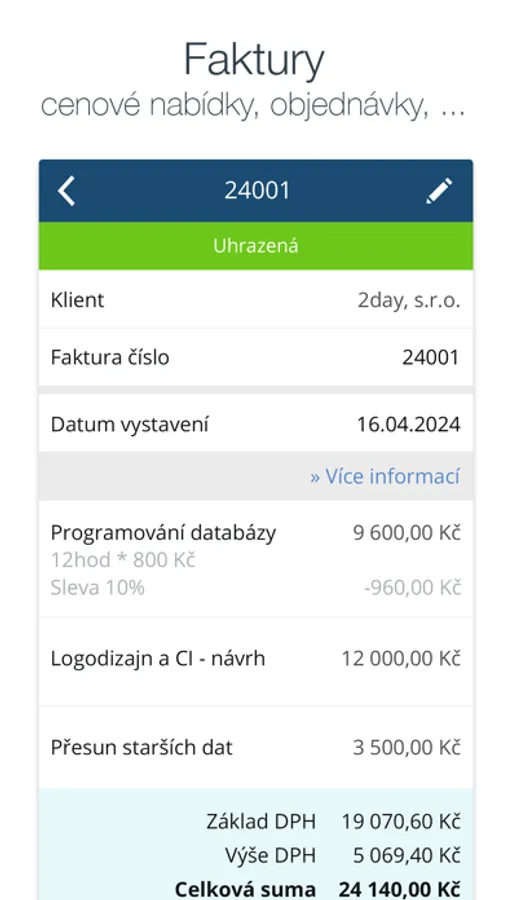 Podpora pro českou i slovenskou legislativu. SuperFaktura je řešením pro živnostníky a malé firmy, které hledají jednoduchý online ekonomický systém. Kromě faktur v ní můžete vystavovat i cenové nabídky, objednávky, dodací listy,... Mobilní verze, propojená na komplexní webovou aplikaci, vám poskytne možnost rychlého vystavení dokladu a mít přístup k přehledům aplikace.