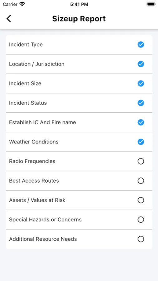 - Checklists. Selectable checklists for common and crucial radio traffic, such as sizeup reports and medical incident reports (8-lines). Check the button next to each topic you hit as you radio in. Remember, it's push to talk, not push to think.