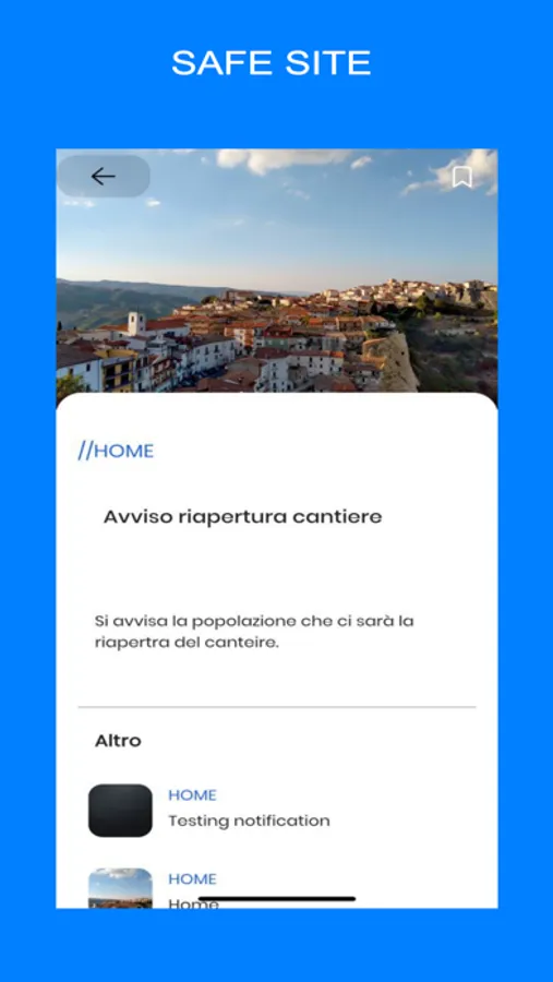 SafeSite è l'App ideale per essere sempre aggiornati sulla storia dei cantieri della tua città. Scarica l'app e sarai in grado di vedere i progetti, i disegni, i render e tutte le informazioni utili sull'area interessata dai lavori vicino alla tua area di interesse. Attraverso questo strumento, potrai contattare facilmente la direzione dei lavori, la ditta o il responsabile del procedimento. Attraverso la sezione "AVVISI" potrai essere aggiornato in tempo reale sull'eventuale chiusura della strada o della piazza in quanto il cantiere è interessato da mezzi pesanti o da chiusure preventive di erogazione idrica o elettrica. Queste ultime informazioni, se si abilita la ricezione delle notifiche, ti saranno fornite anche attraverso "notifiche push", in tempo reale.