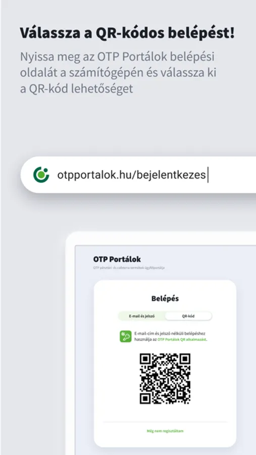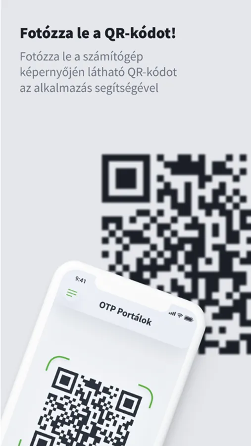 Az OTP Portálok QR kód olvasó alkalmazás segítségével e-mail-cím és jelszó nélkül ujjlenyomattal, arcazonosítással vagy PIN-kóddal léphet be az otpportalok.hu felületre regisztrációt követően. A regisztráció során szükséges megadni az e-mail címet és jelszót. A QR kód a www.otpportalok.hu bejelentkezés felületén található. Az alkalmazás csak az OTP Portálok (vagy Ügyfélportál) felületre való belépés könnyíti meg, itt nem lehet a portál funkciókat igénybe venni.