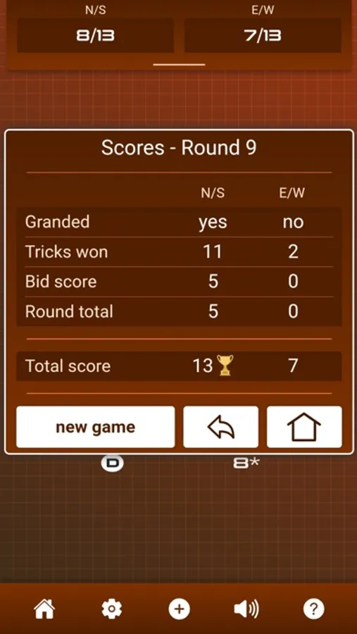 At the end of each round, points are scored by the number of tricks each partnership has collected. In a high bid round, a point is awarded to the team who granded for every trick taken over 6. If the team who granded fail to make 7 tricks, the other team are awarded either 1 or 2 points per trick taken over 6 depending on the 'set bonus' setting. In a low bid round, a team is awarded 1 point per trick taken less than 7.