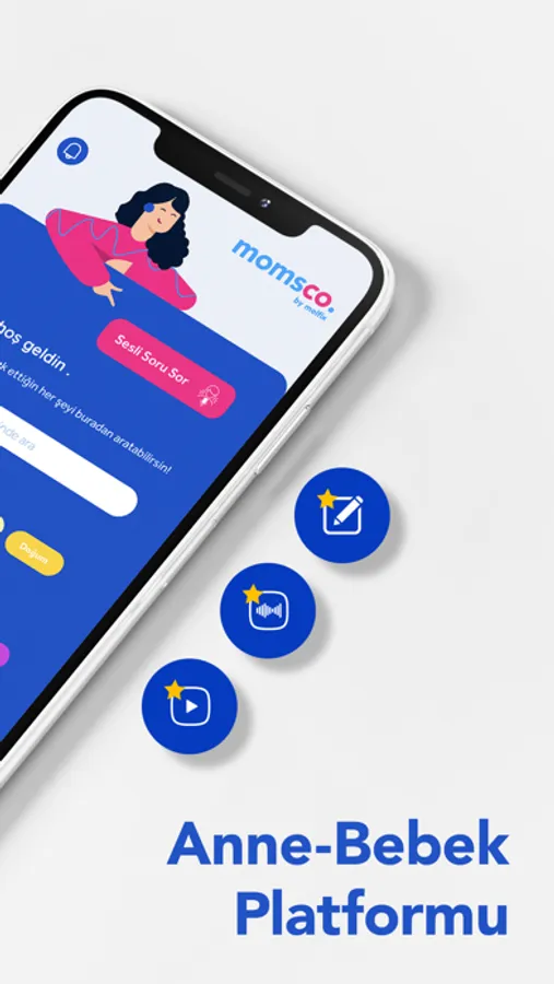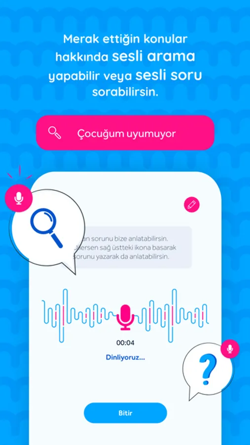- Gebelik, çocuk bakımı, annelik ve bebeğin hakkında her sorunu sesli veya yazılı olarak kaydederek bize ilet, cevabın uzmanlarımız tarafından gelsin.