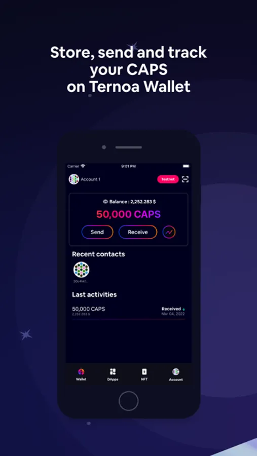 The Ternoa Wallet is your gateway into the Ternoa universe, allowing users to manage their CAPS tokens, decrypt augmented NFTs, and access unique DApps build on the Ternoa Blockchain.