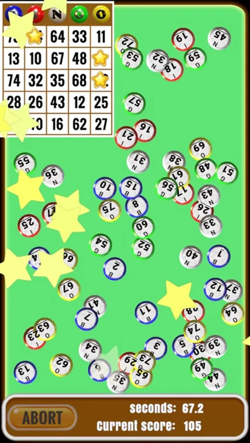 The game rules are straightforward: (1) you start a competing challenge; (2) the game assigns you a standard Bingo card; (3) the 75 balls drop on the game's board and keep moving; (4) you have to catch five numbers presented in a line or diagonal on your card. You have a limited time to catch your winning numbers, which give you extra points, plus a time bonus. Each wrong catch takes points away from your total. The player with higher final points wins the game.