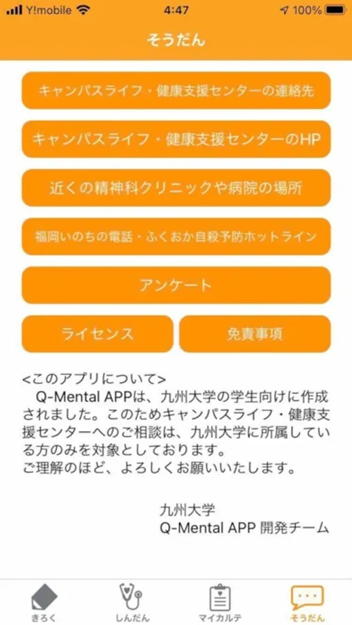 Q-Mental APP is a mental health application for university students developed by Kyushu University. Under the supervision of Associate Professor Kosuke Kajitani, a psychiatrist, students of Kyushu University (enrolled at that time) were responsible for the visual design. The development of this application was completed after a series of revisions conducted after university students actually used the prototype. There is no other mental health application in the world that has been created from the perspective of users (university students) in this way. The app has four functions: 1) "RECORD"—to record daily appetite, exercise, sleep, and mood; 2) "DIAGNOSIS"—to screen for mental illness; 3) "PERSONAL RECORDS"—to give advice based on the past week's "RECORD"; and 4) "COSULTATION"—to display a place to consult in conjunction with the map app. We hope this will be useful in supporting the mental health of university students. Please note that some of the "Sodan" functions are only available for Kyushu University students.