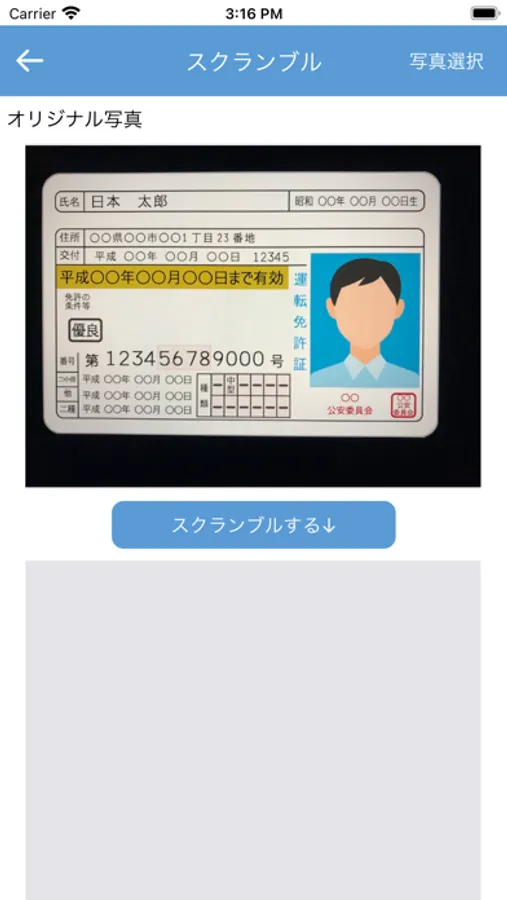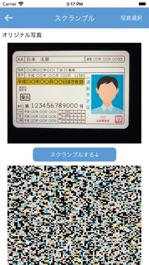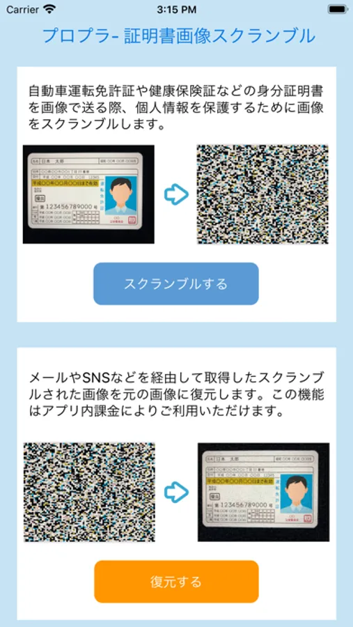 本アプリは、自動車運転免許証など本人を証明する資料を画像で送信する際、個人情報が漏れないように画像をスクランブル処理するアプリです。メールやSNSなどで送信する画像を送信者が本アプリを使ってスクランブル処理し、画像を受け取った受信者は本アプリを使用することで画像を復元できます。