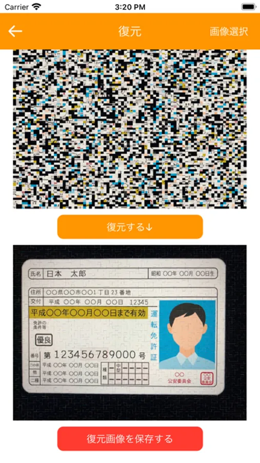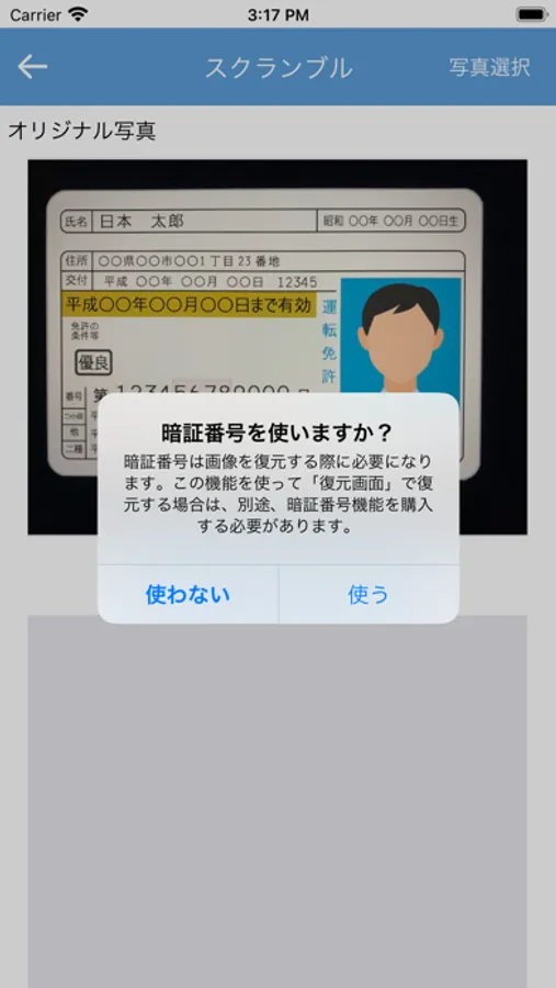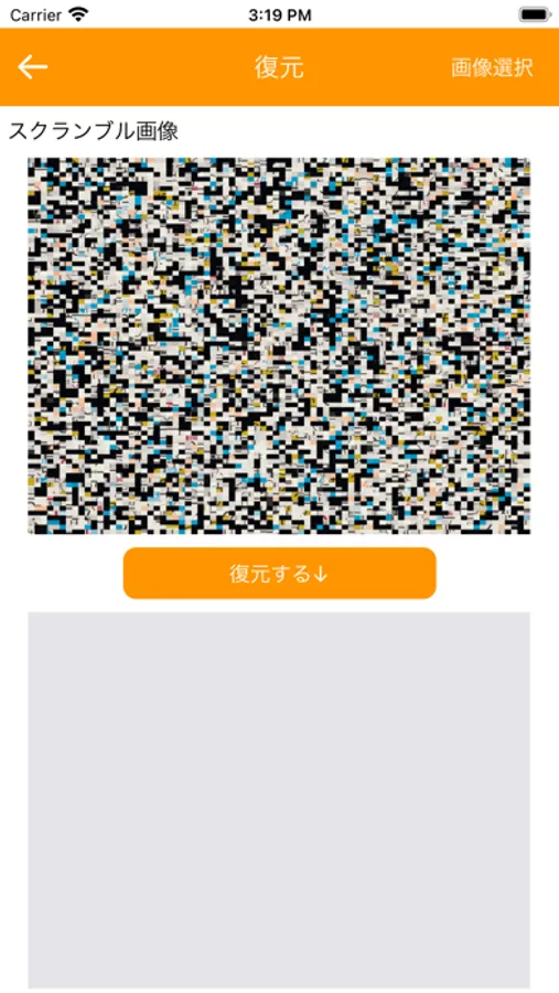 ・復元画面右上にある「写真選択」ボタンをタップしスクランブルされた画像を選択すると選択画像が表示される