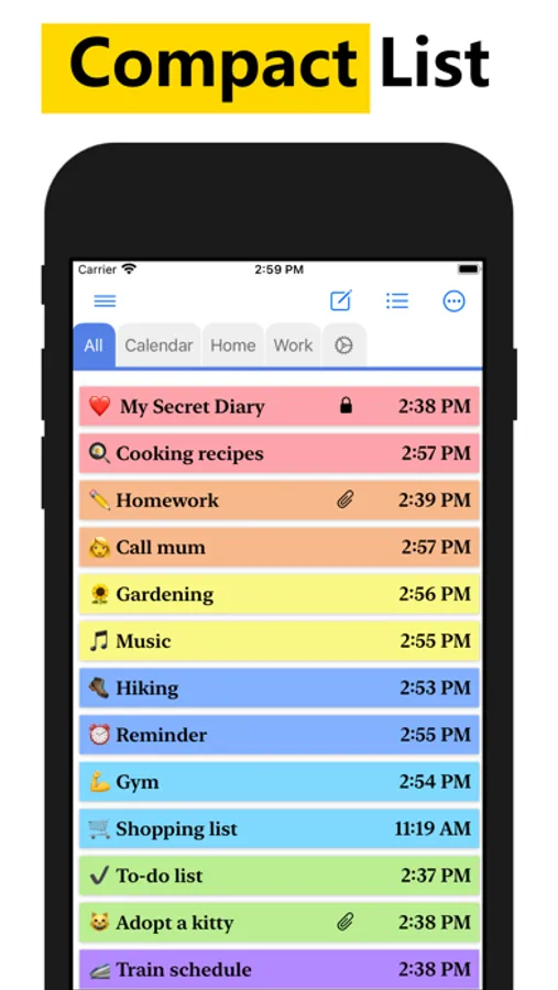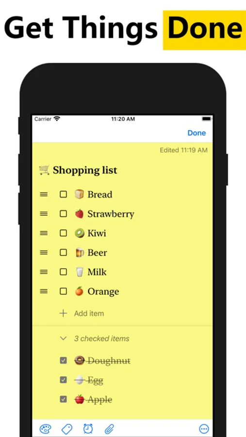 In to-do list mode, you can add an unlimited checklist. Arrange their order with a simple tap and move. When finishing with an item, you can perform a simple tap to strikethrough it.