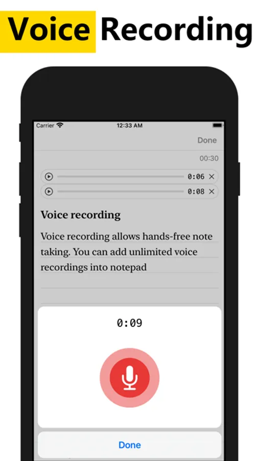 • Voice recording allows hands-free note taking. You can add unlimited voice recordings into notepad