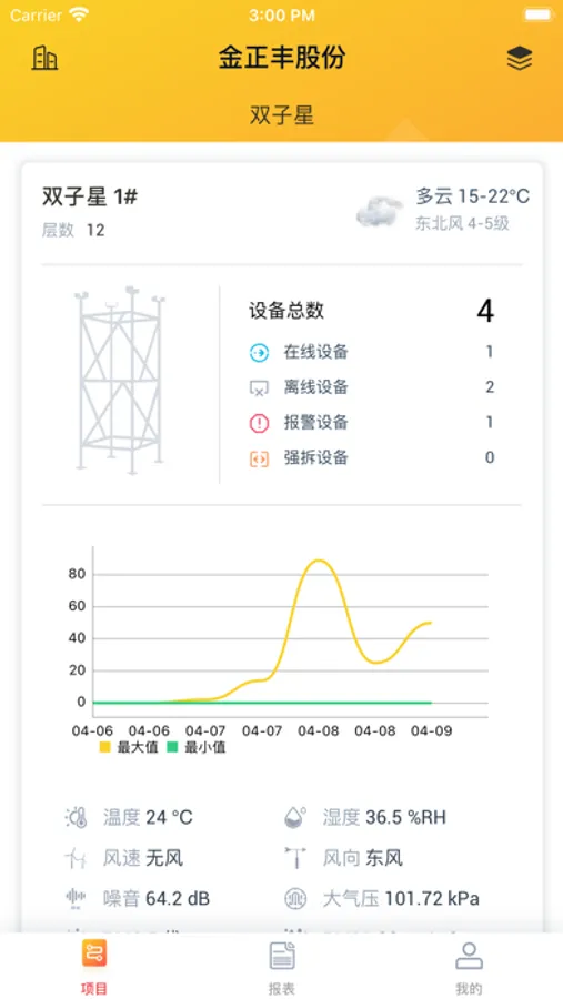 金正丰APP,通过物联网技术,结合大数据与人工智能,对工地的脚手架监控设备进行监控,及时了解设备运行状态,及周边环境信息。当设备触发警报时,APP将第一时间收到报警推送,通过警报声音以及消息文本通知用户,确保用户无法何时何地只要手机在身边就能第一时间收到报警通知,以提高工地的安全生产。