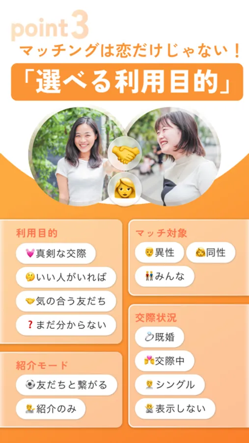 -利用目的を恋人、友だち、紹介者で自由に選択できて
