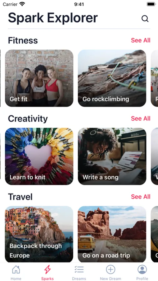 Can’t think of anything? Find your spark and browse hundreds of great ideas, both big and small, for things to do in your life. Explore featured links and tips on how to reach your dreams. Connect with others and support each other on your journey to reach your goals.