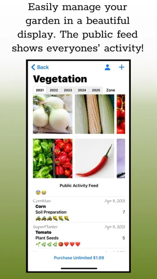 Additionally, the main page has a public 'feed' which will cycle through the activities of all the people who are using the app. You can monitor the feed to get a sense of the timing and types of crops that people within your planting zone are doing. So with this fun gardening app, there is a social media aspect to it as well.