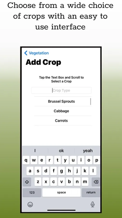 Especially useful would be to add several crop types of the same type. The app would allow you to keep track of your activity and progress in experimenting in which horticulture techniques are most effective for. your location.