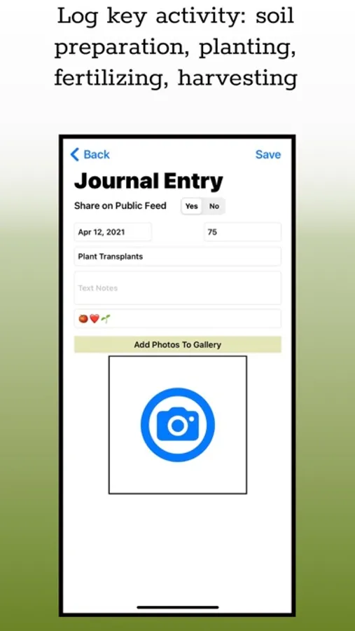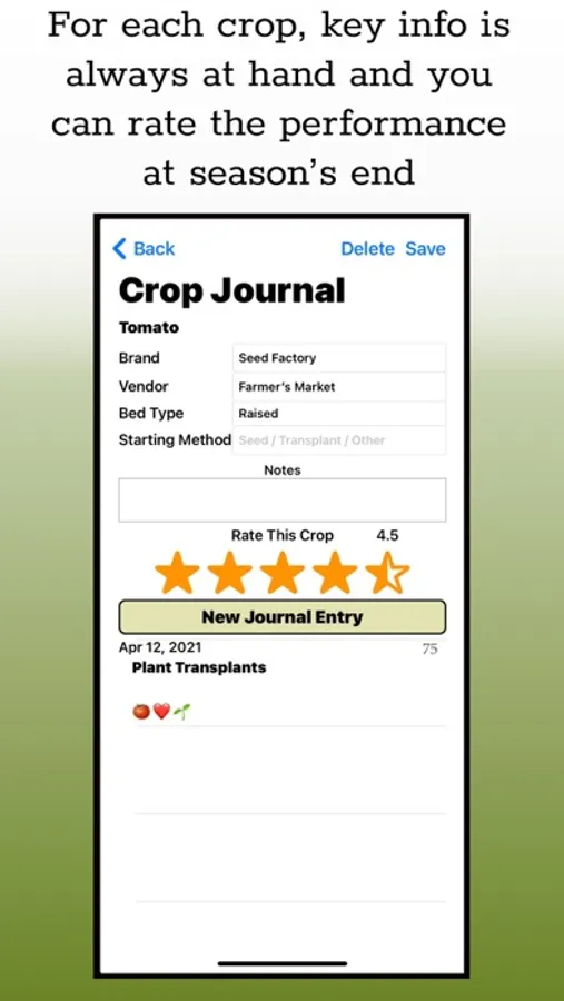 Then for each crop, you can record individualized journal entries. Use the interactive and easy interface to record the dates of key activities: soil preparation, planting, soil amendments, harvest, and winterization.