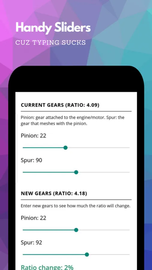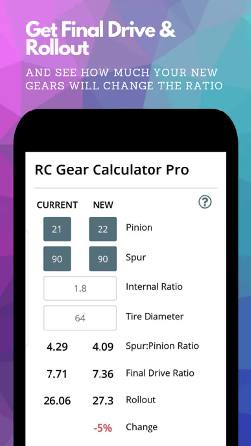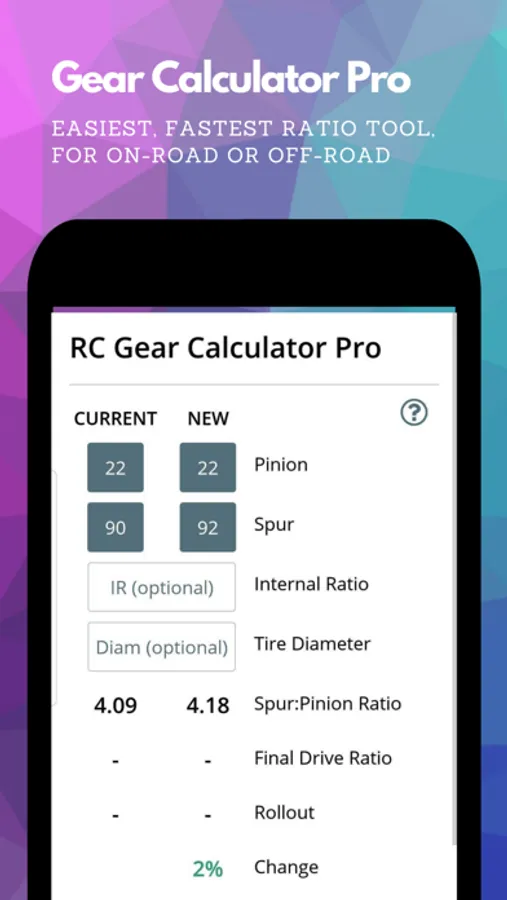 Easily calculate your gear ratio, and to really understand the effect of your change enter your "before and after" gears and see what percentage change it will produce, so you'll know how much the new gear ratio will change your speed and acceleration and how much load it will put on the motor. Great for all types of RC racing and bashing.