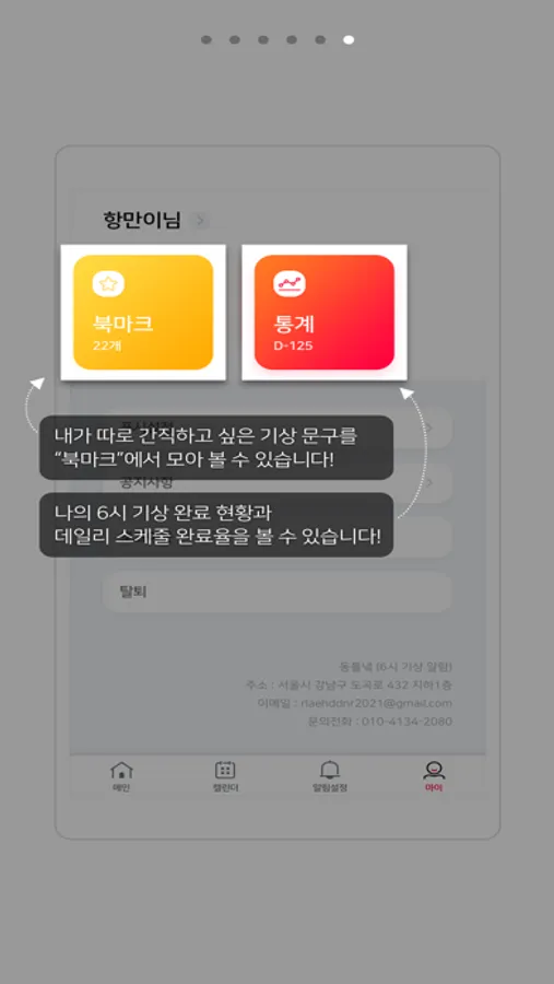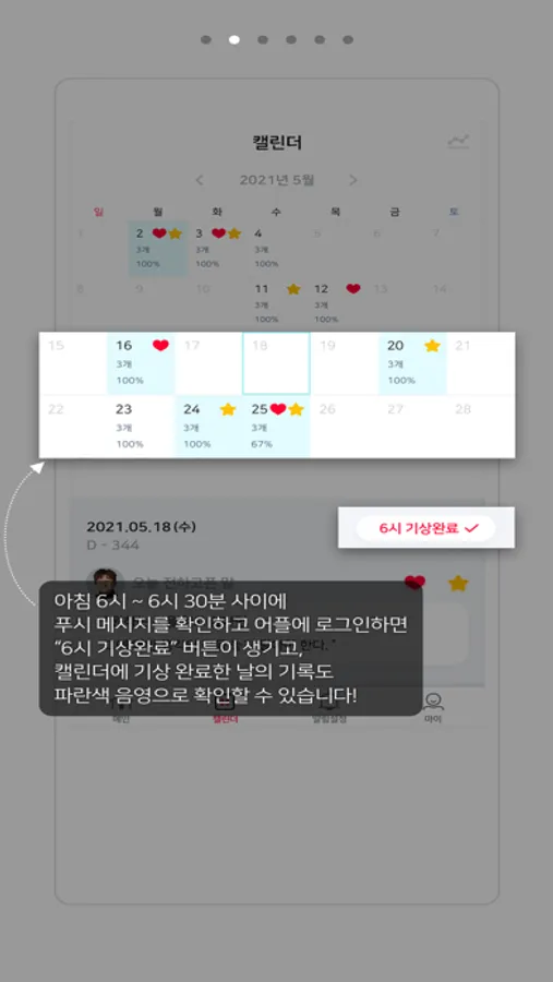 - 이를 통해 스스로 6시 기상 완료율을 확인하며 실천의 정도를 확인할 수 있습니다.