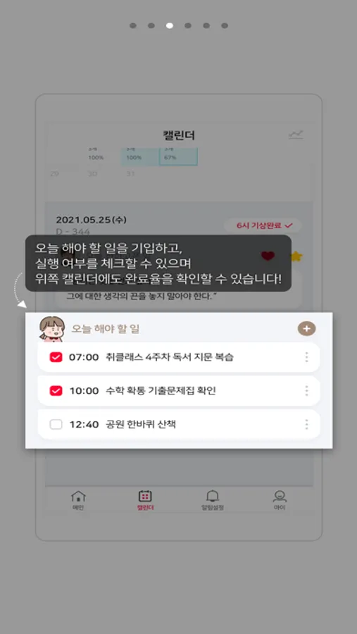 - 그 외에 식사알람, 공부알람, 취침알람도 스스로 설정할 수 있습니다.