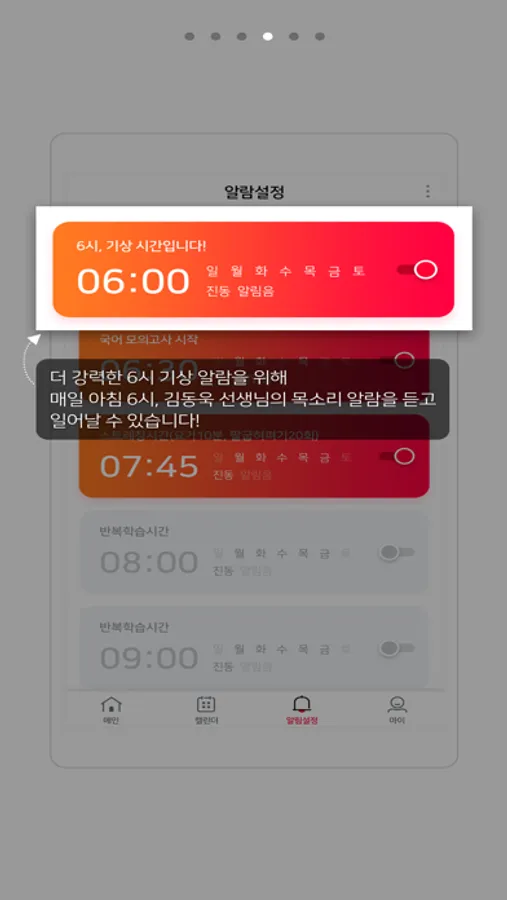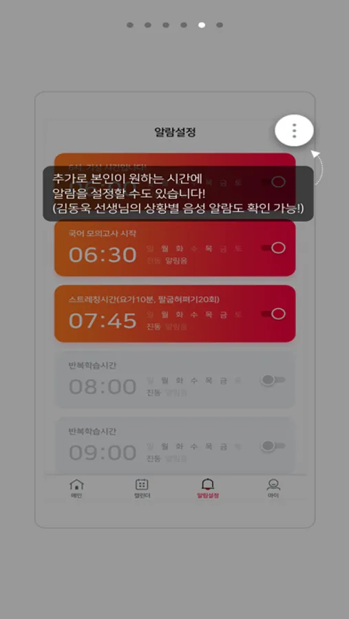 - 김동욱 선생님의 목소리로 알람을 제공합니다. (기본 세팅이며, 선택적 해제 가능)
