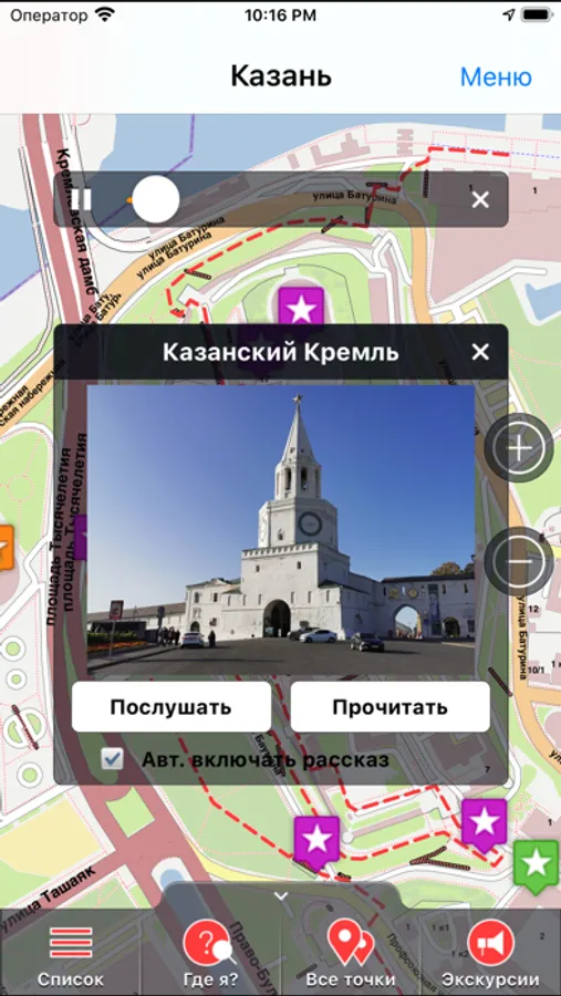 ● ЭКСКУРСИИ ПО КАЗАНИ. Воспользуйтесь предварительно составленными маршрутами прогулок, включив автоматический режим экскурсии. Подробнее о маршрутах на нашем сайте 1000guides.com