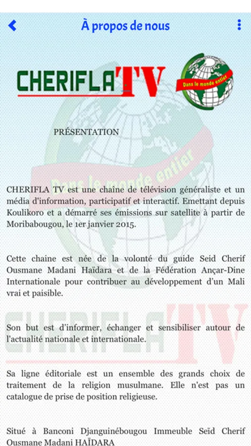 Téléphone. : +223 20240651 / +223 99861010 - E-mail: info@cheriflatv.com