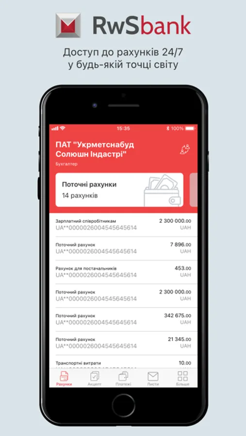 RwS Вusiness is a client-bank that allows you to remotely manage your business 24/7.