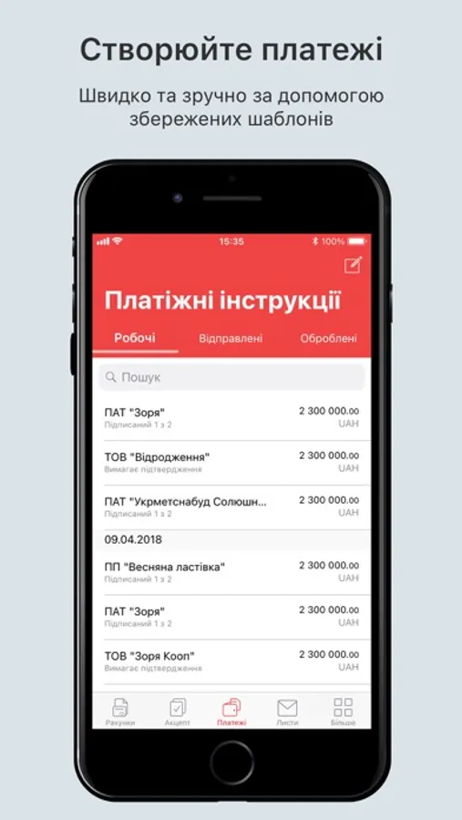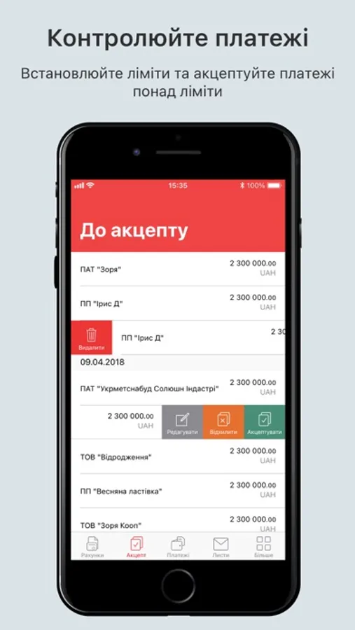 Payment control rules are set directly by the responsible employee: limits can be set for each payment in favor of any or a specific recipient, as well as a daily limit on the amount of all payments.