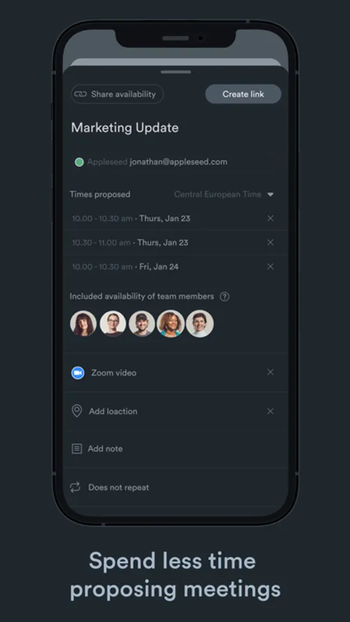 - Propose meeting times: Avoid back-and-forth emails with our scheduling app and Calendly alternative. Share availability with people outside of your organization and let them book a time that works with you or your team's schedules.