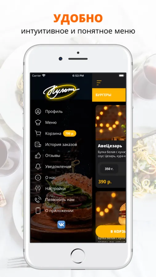 В приложении КУЛЬТ БУРГЕР Вы можете: