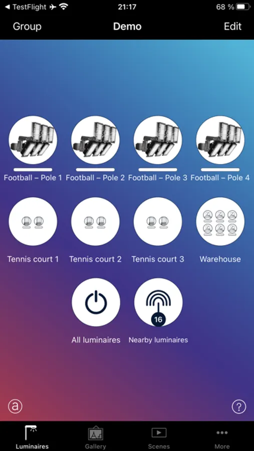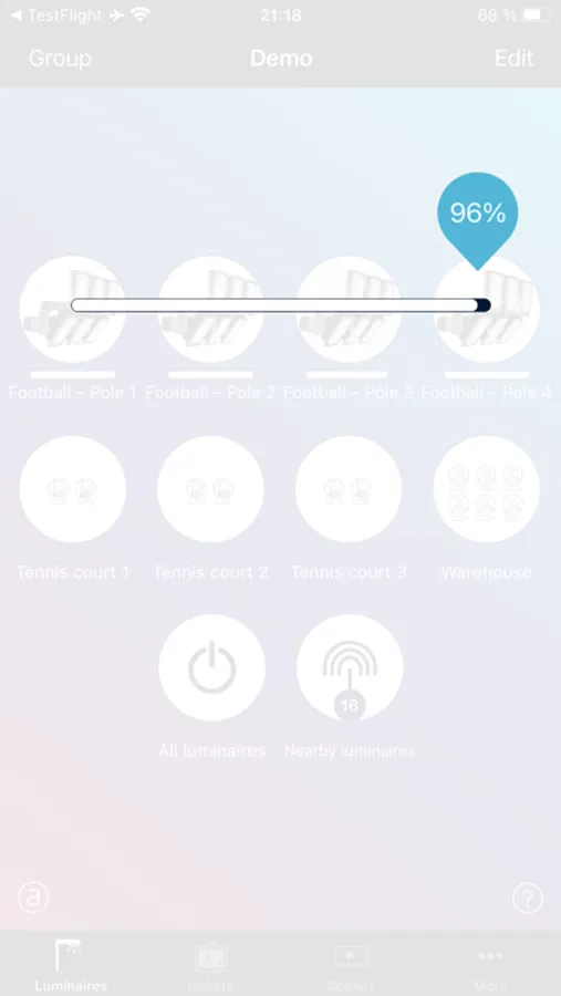 With ITERRA app you can control all your lighting fixtures with one simple view. It is possible to control your lights individually or as a group. For example, you can create a group for your football training pitch, your main tennis court, your car park, and turn them all off / on with just one tap. You can also dim the light in your sports facilities depending on the requirements (match, training, maintenance).