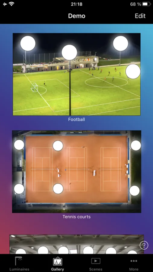 The Gallery in the ITERRA app is the most natural way of controlling your luminaires. Take a picture of your venue and place the luminaire controls over the lighting fixtures in the picture. Now you can control your lighting fixtures visually right from the picture.