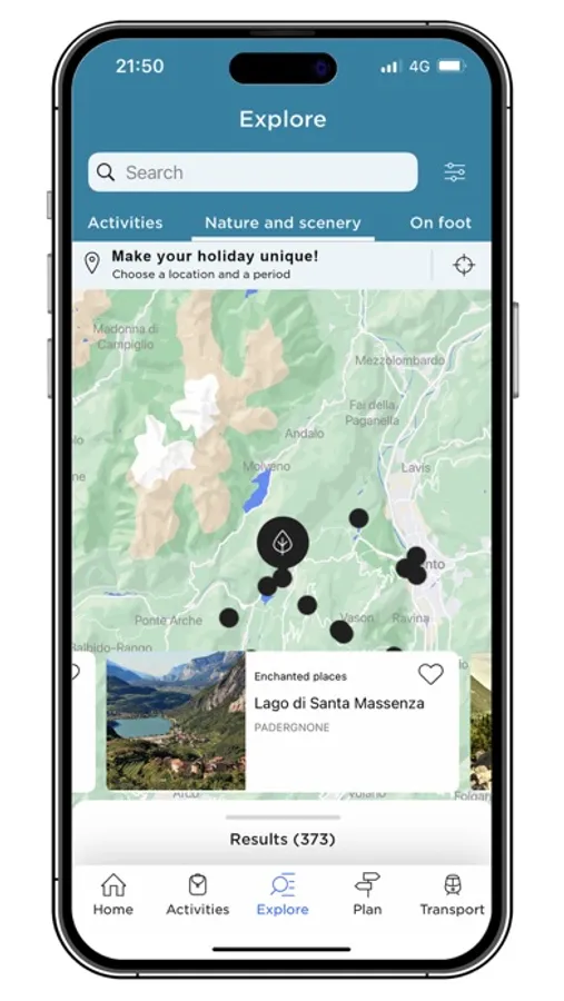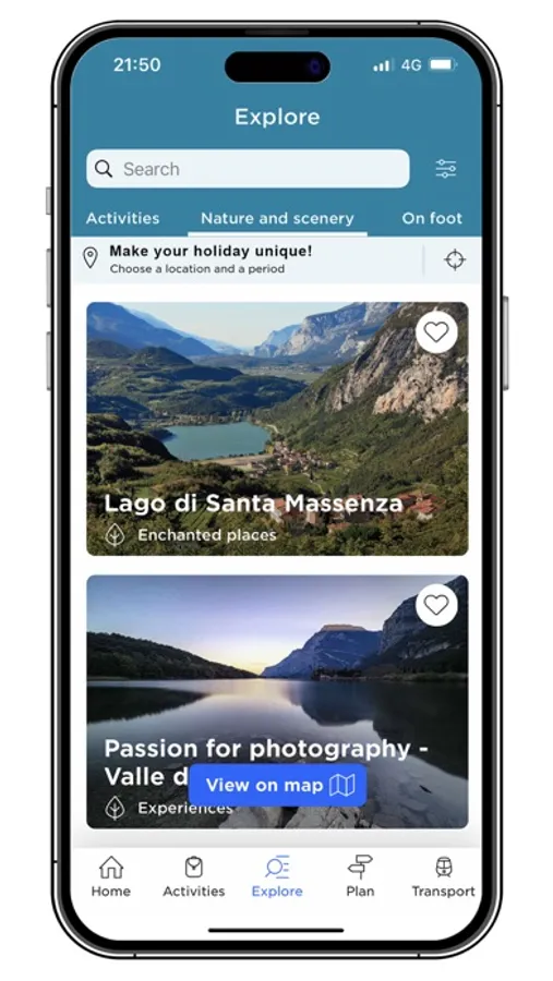 The Mio Trentino app uses your tastes and geolocation to instantly suggest the most exciting holiday experiences on offer near you: from art to good food and from sport to relaxation, without forgetting about events and festivals. If you want to expand your search to all of Trentino, all you need to do is use the app’s “explore” function.