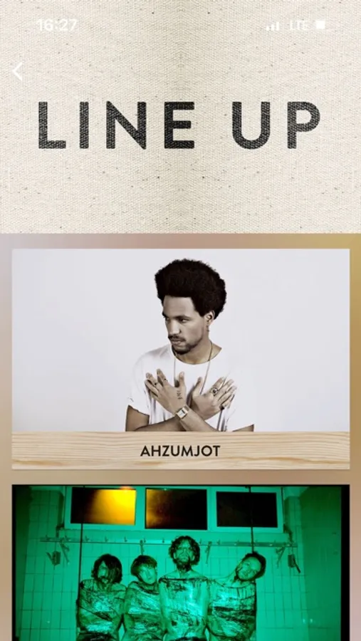 - Das komplette Line-Up kann über die App abgerufen werden. Sobald man auf einen Künstler tippt, öffnet sich hierzu die Seite mit Informationen zu dem jeweiligen Künstler, sowie einem Bild und Verlinkungen zu seiner/ihrer Homepage und den Social-Media-Kanälen.