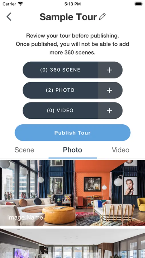 After capturing all of the panos, you can move on to take still photos and videos of the spaces (optional). When you are done shooting the entire area, you can either save and exit to publish with a Wifi connection or publish the virtual tour immediately.