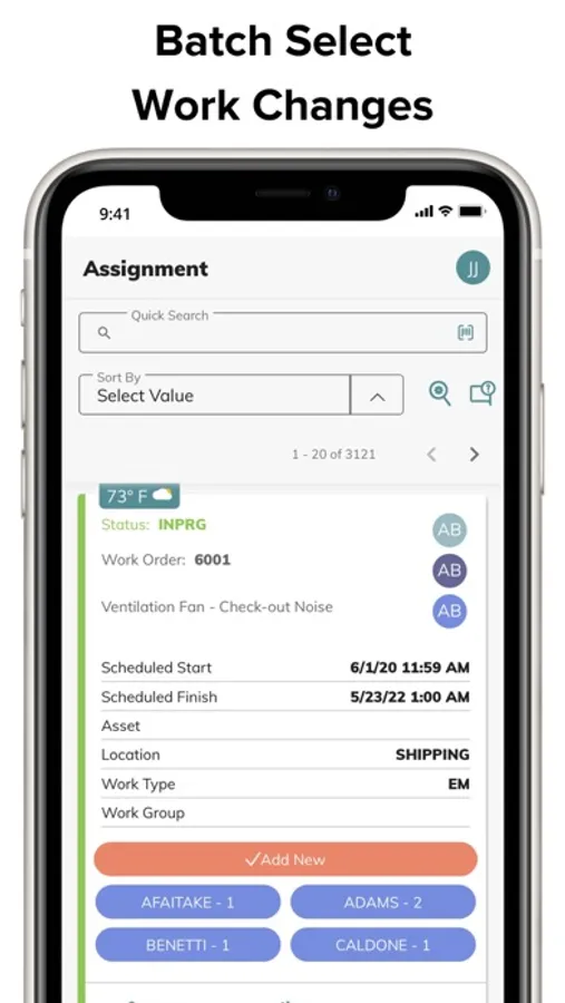 • Batch Select Work Changes: Batch select work for re-assignment or update. If you need to adjust day, time, duration or assigned staff for a group of work orders, you can update them all in a single click.