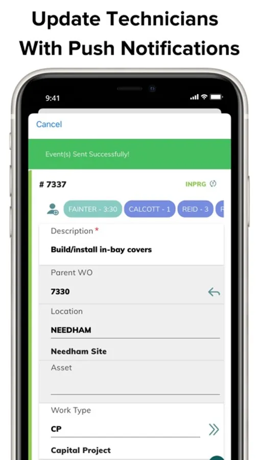 • Update Technicians with Push Notifications: Use mobile push notifications to add work orders directly to technicians’ calendars and to notify team members of new assignments, specific activities and status changes.
