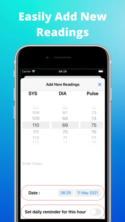 Blood Pressure monitor allows you to keep track of your readings. You should keep track of your blood pressure, heartbeat, and other vital signs. There's also a section for notes.